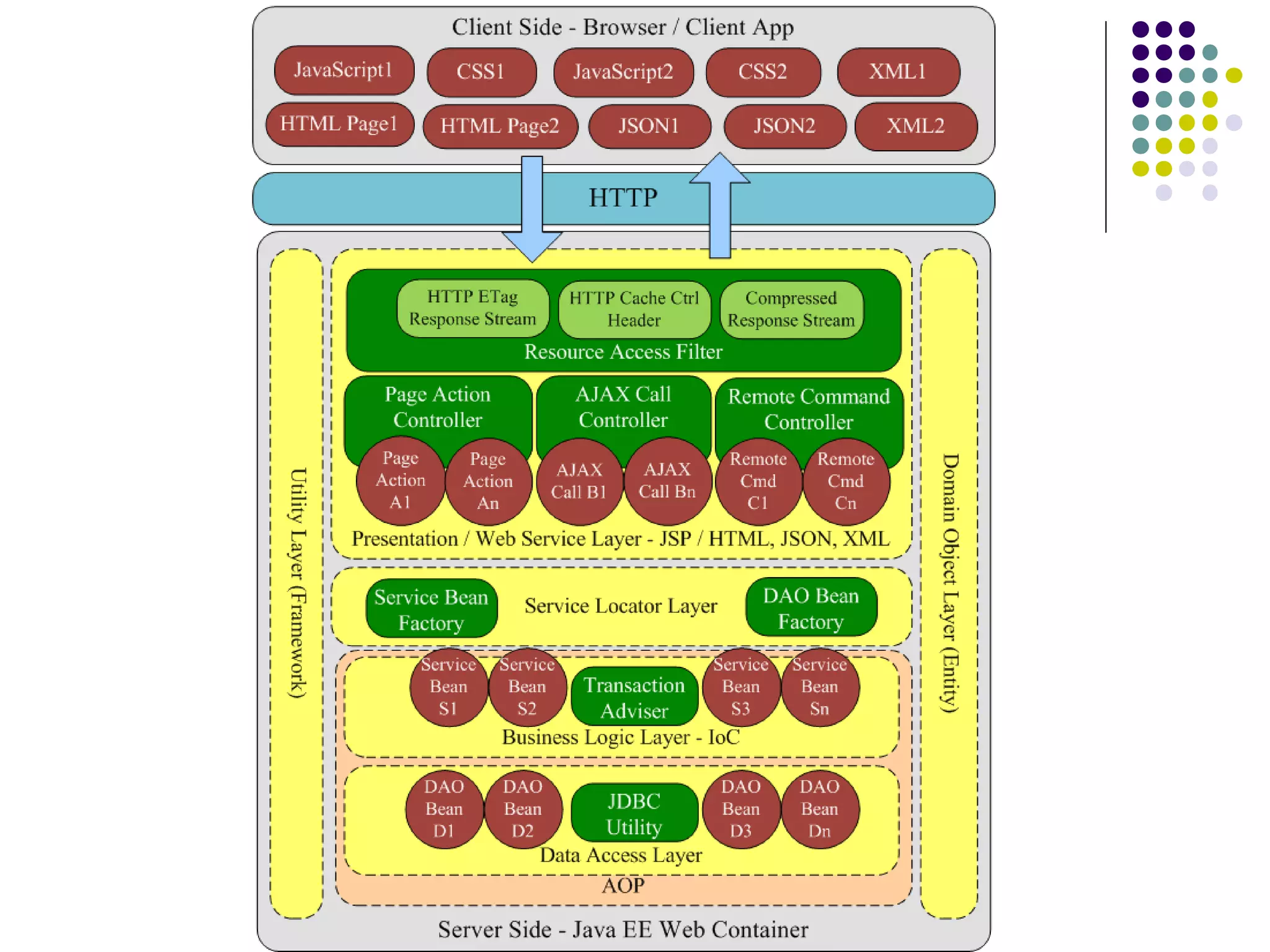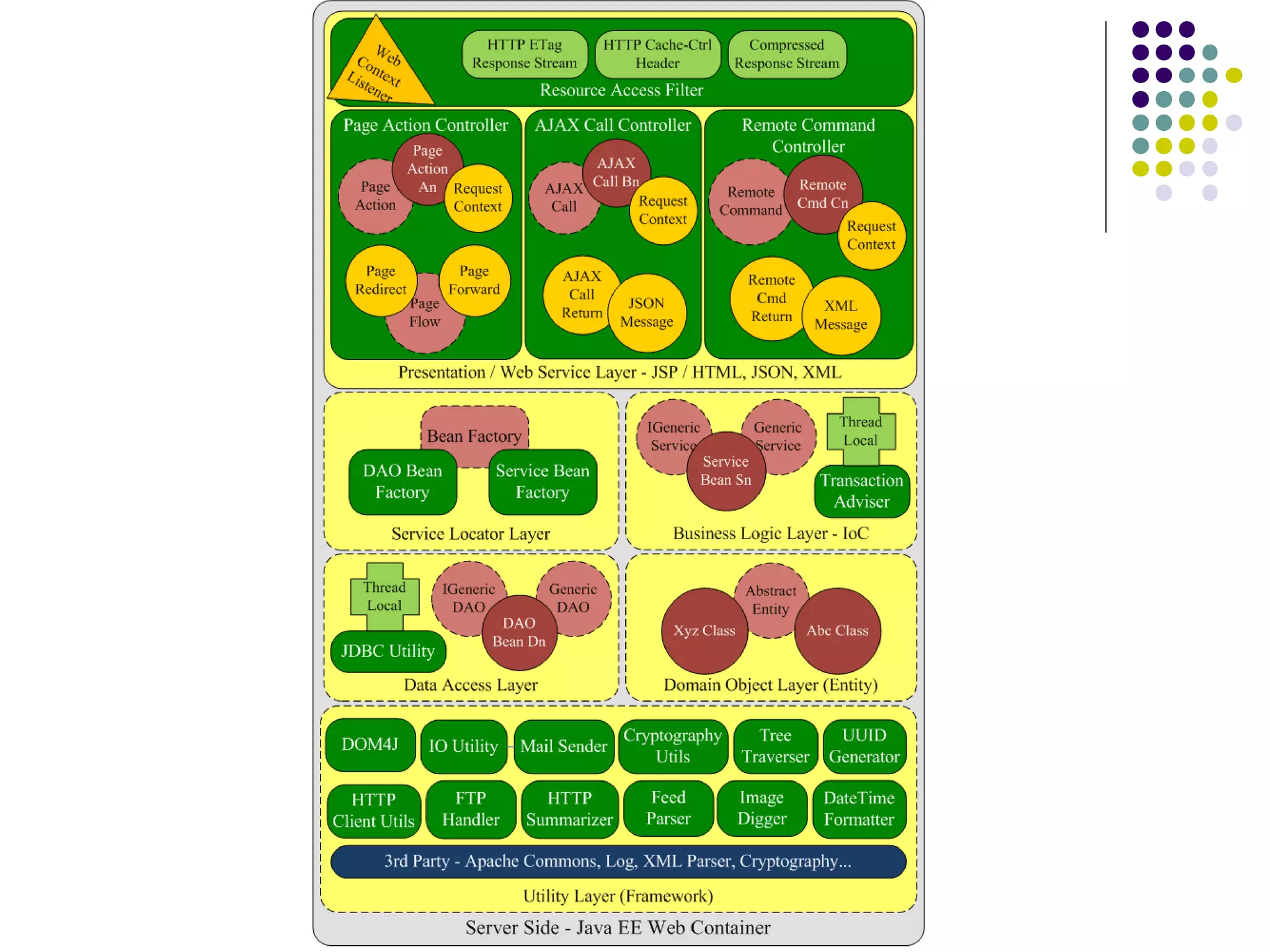 This document describes the multilayered architecture of the eSobi website. It consists of a presentation layer that handles requests and responses, a service locator layer that manages services and data access objects, a business logic layer that contains services, a data access layer for database interaction, a domain object layer for modeling data, and a utility layer. Aspect oriented programming is used to increase modularity by separating cross-cutting concerns like transactions using dynamic proxies.