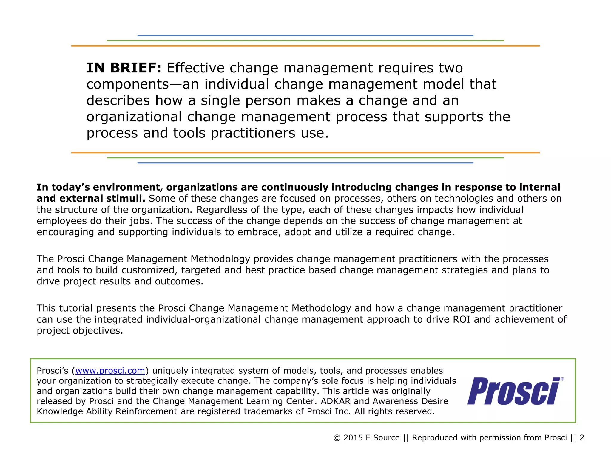 The document discusses the integrated individual-organizational change management approach, emphasizing the importance of both individual and organizational change management models for successful transitions within organizations. It details the Prosci ADKAR model as a framework for individual change, while introducing a three-phase organizational change management process to support these individual efforts. The overall methodology aims to align activities with desired outcomes, ensuring that changes are effectively embraced by employees.
