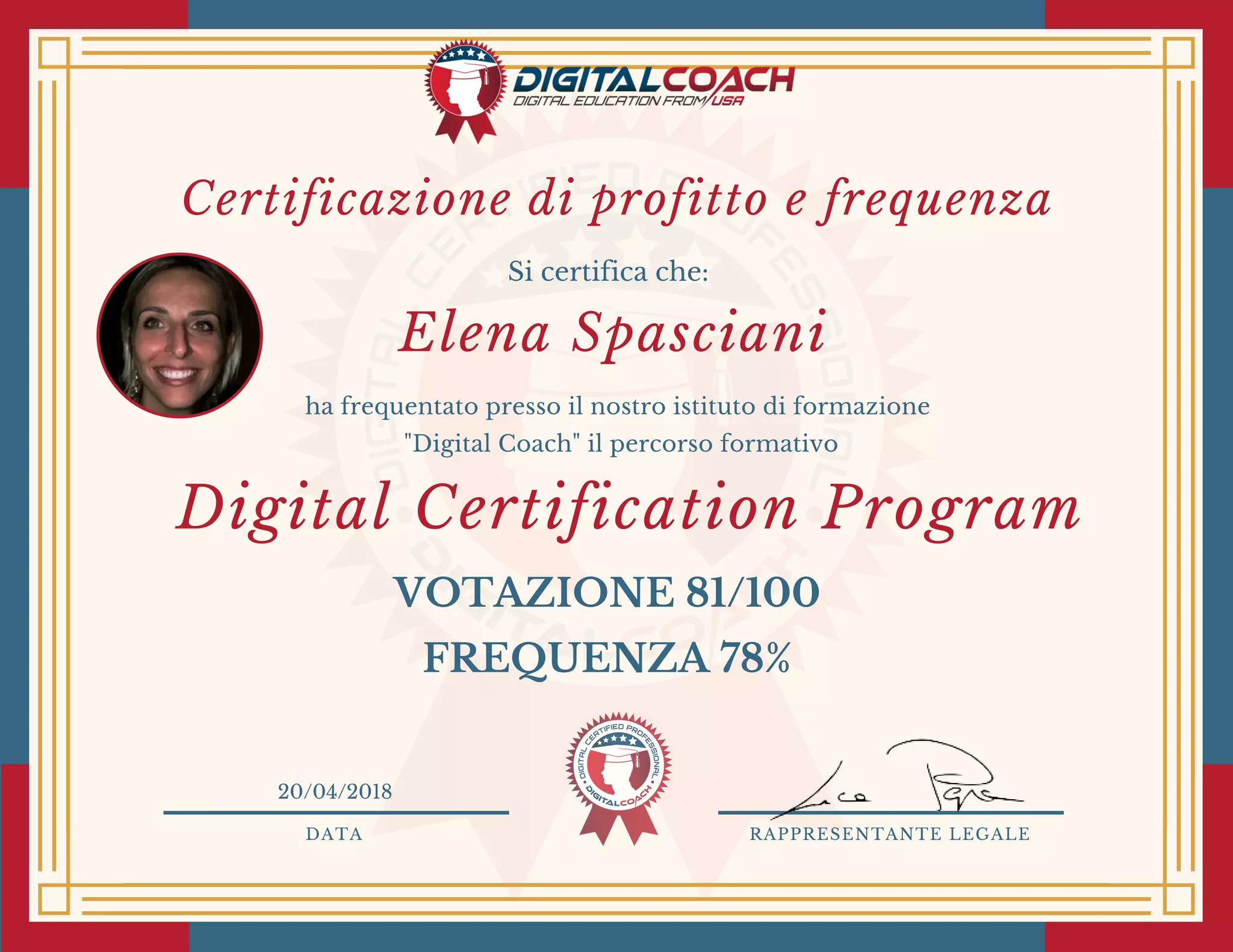 Elena Spasciani ha completato il programma di certificazione digitale presso l'istituto di formazione 'Digital Coach' il 20 aprile 2018, conseguendo un punteggio di 81/100 e una frequenza dell'78%. Il percorso formativo ha coperto vari aspetti del marketing digitale, tra cui SEO, SEM, social media marketing, e-commerce e content marketing. Sono state sviluppate competenze pratiche su strumenti e tecniche utili per una strategia di marketing integrata e efficace.