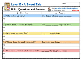 Mrs. Beaver wakes up early and wants to make a special treat. She makes dough first and cooks it on the fire. After it is cooked, she puts the dough on a rock. The document is a reading comprehension worksheet about Mrs. Beaver baking bread. Students are asked questions and need to fill in the answers based on the short story.