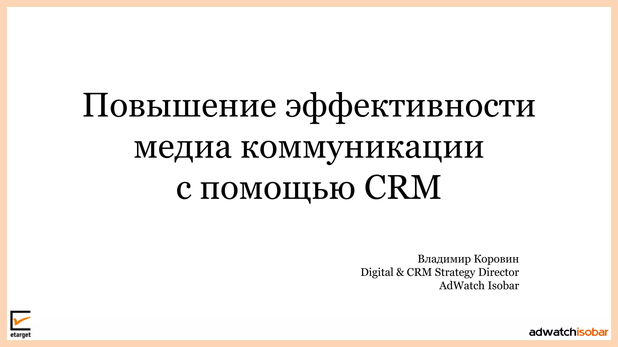 Документ рассматривает повышение эффективности медийной коммуникации с помощью CRM, акцентируя внимание на необходимости понимания потребительских предпочтений для оптимизации медиа-бюджетов и персонализации сообщений. Упоминается использование данных для формирования знания о бренде, восприятии и лояльности, что позволяет улучшить охват и коммуникацию с целевой аудиторией. Примеры показывают, как переход от массовой к целенаправленной коммуникации может существенно снизить расходы на медиа и увеличить ROI.