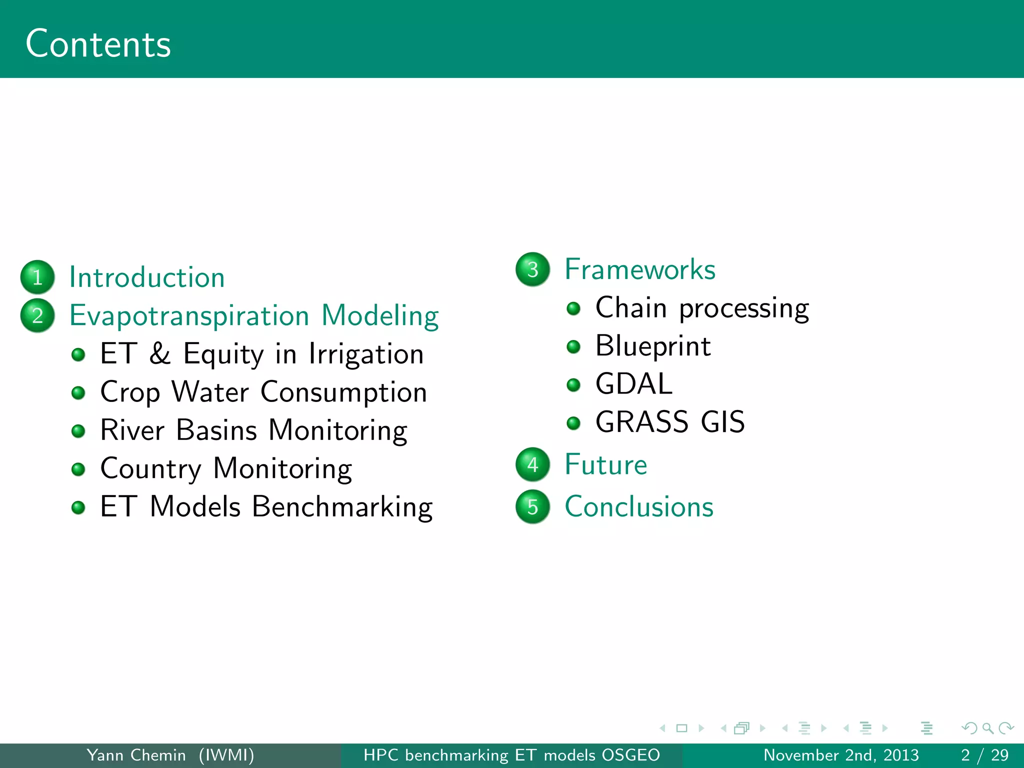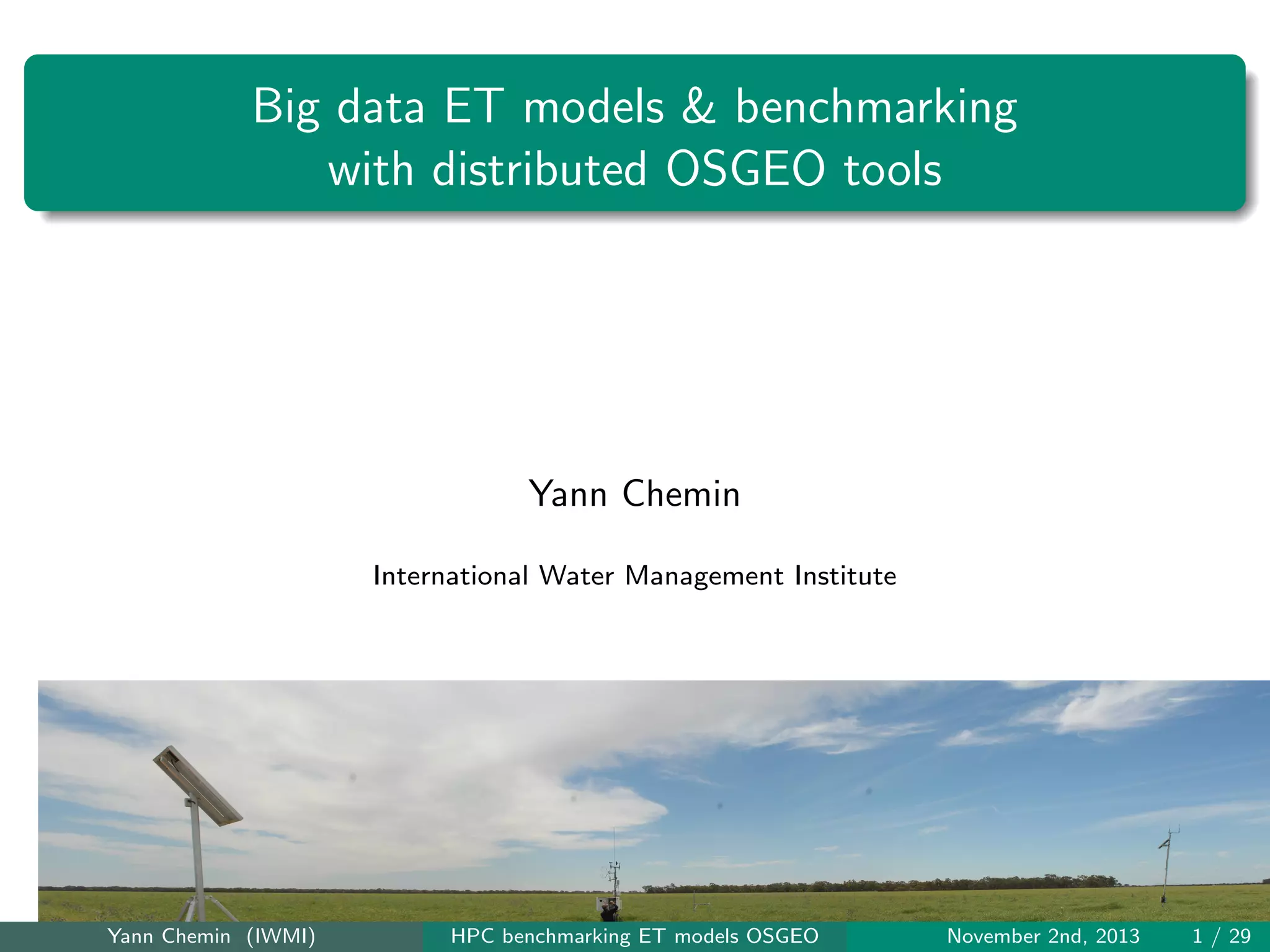 The document presents an overview of evapotranspiration (ET) modeling and benchmarks using distributed OSGeo tools, emphasizing the significance of ET in water management, irrigation systems, and climate change impacts. It discusses various ET modeling methods, the equity of water use, and methodologies for monitoring water consumption at multiple scales, with a focus on advancements in high-performance computing (HPC) technology. The conclusion highlights the need for collaboration in utilizing free and open-source software for global water monitoring initiatives.