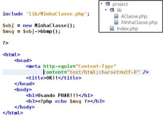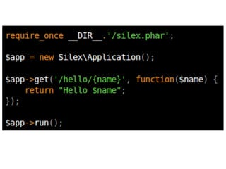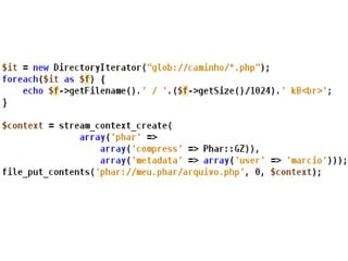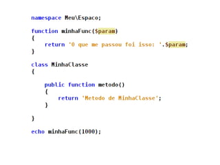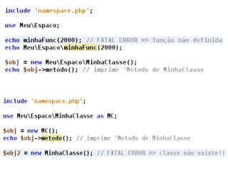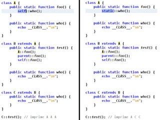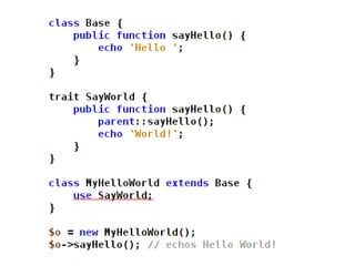 The document discusses new features in PHP 5.3 and 5.4, including namespaces, closures, late static binding, PHAR, DateInterval, DatePeriod, __callStatic(), __invoke(), and $class::myFunc(). It also mentions features like fileinfo, Intl, SQLite3, user.ini configuration, and removed obsolete functions. PHP 5.4 additions include traits and upload progress reporting.