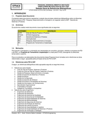 The document serves as a comprehensive reference guide detailing various bibliographic sources related to research, development, and innovation (PDI) and systems and product assurance (GSP). It contains sections on management and engineering references, covering topics such as project life cycles, cost management, risk management, and quality assurance methodologies. Authored by Antonio Sallum Librelato in October 2011, it aims to support training and dissemination of knowledge on these critical themes.