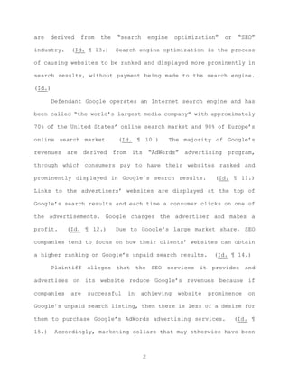 This document summarizes a court case between E-Ventures Worldwide, LLC and Google, Inc. E-Ventures alleges that Google removed over 300 of E-Ventures' websites from Google search results, which harmed E-Ventures' business. E-Ventures claims Google removed the websites for anticompetitive reasons because E-Ventures provided search engine optimization (SEO) services that reduced demand for Google's advertising services. Google argues the websites were removed for violating its content policies. The court will review Google's motion to dismiss the case.
