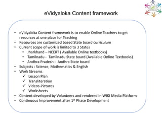 The Evidyaloka Content Framework aims to centralize teaching resources for online educators, focusing on customized materials based on state board curricula from Jharkhand, Tamil Nadu, and Andhra Pradesh, primarily for subjects like science, mathematics, and English. The content, developed by volunteers, includes lesson plans, videos, worksheets, and transliterations, and is designed for continuous improvement through ongoing feedback. The framework emphasizes collaboration and efficient resource allocation within a structured volunteering process.