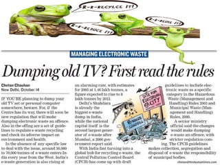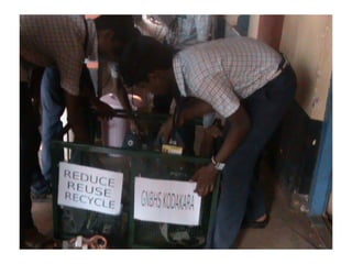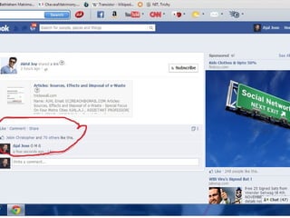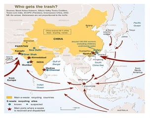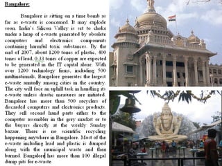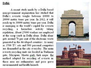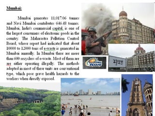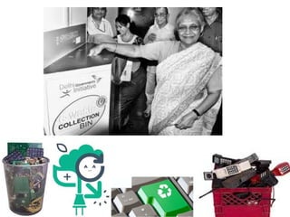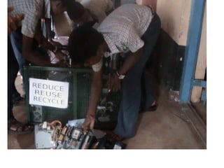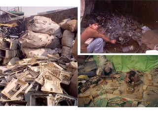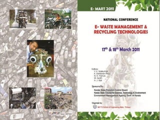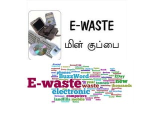 This document discusses e-waste and its management. It defines e-waste as obsolete electronic equipment like computers, TVs, and cell phones. E-waste is a growing problem due to the toxins it contains and risks of improper disposal. When e-waste is burned or dumped, its components like lead, mercury, and flame retardants can pollute the environment and harm human health. However, e-waste also contains valuable materials that can be recovered through formal recycling. Proper e-waste management and recycling can help address this issue in a more sustainable manner.