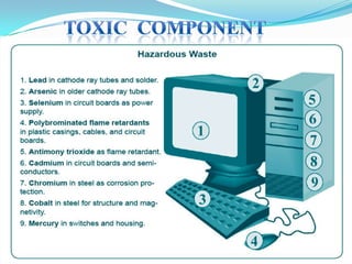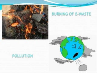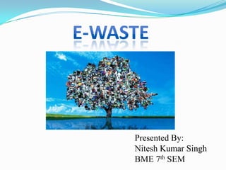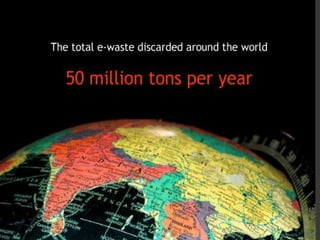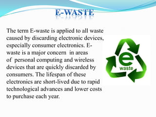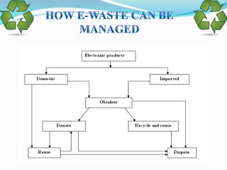The document discusses electronic waste (e-waste) and its management. It provides background on e-waste, noting that it is waste from discarded electronic devices that are quickly replaced due to technological advances. It then discusses several key points around e-waste including that it contains hazardous materials, the short lifespans of electronics contribute to large volumes of e-waste, and that improper disposal can harm human health and the environment. The document concludes by emphasizing the importance of proper e-waste recycling and management.