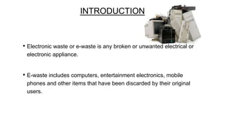 Electronic waste (e-waste) is rapidly increasing globally, with an estimated 50 million tons produced annually, posing significant environmental and health threats due to toxic materials. Major e-waste dumping sites like Guiyu, China, showcase severe pollution and health issues, particularly among children exposed to lead and other hazardous substances. Effective e-waste management requires collaboration among governments, industries, and citizens to promote recycling, sustainable product design, and reduce waste generation.