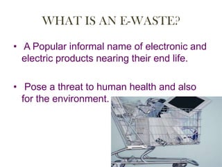 E-waste management is important because electronic and electric products nearing their end of life, called e-waste, pose threats to human health and the environment if not properly disposed of. E-waste must be managed to prevent pollution of groundwater, acidification of soil, and emission of toxic fumes and gases. The government, industries, and citizens all have responsibilities in e-waste management - the government establishes laws and regulations, industries implement management options and labeling to assist recycling, and citizens choose more sustainable electronic products.