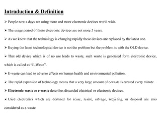 The document discusses the increasing issue of e-waste due to the rapid turnover of electronic devices, with a focus on its environmental and health impacts. It highlights that India is a major contributor to global e-waste and outlines strategies for reducing e-waste, such as extending the lifespan of electronics and recycling. The document also encourages consumers to reconsider their electronic purchases and be mindful of the materials used in devices.