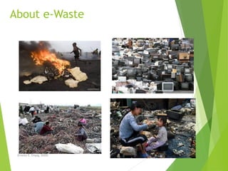 The document discusses the categorization and management of electronic waste (e-waste) at MSU-IIT, detailing various types of e-waste including ICT equipment, office electronics, and household appliances. It highlights the harmful effects of toxic substances found in e-waste and outlines a methodology for effective e-waste management, including assessment, inventory creation, and establishing recycling systems. Additionally, it suggests action plans for database creation, collection periods, and the application of the 4Rs (Recovery, Recycle, Resale, Reuse) in e-waste management.
