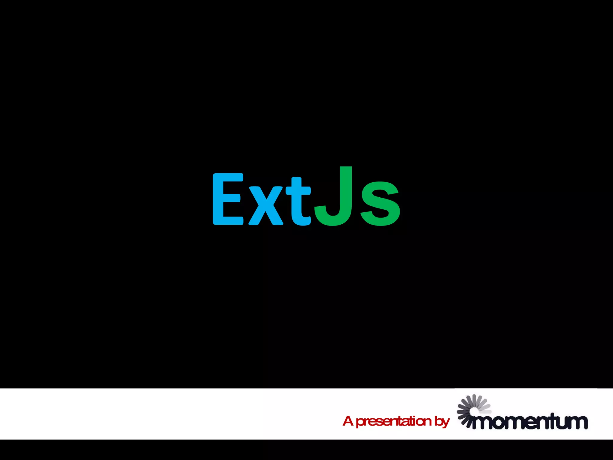 This document provides an overview of ExtJs, including what it is, where it came from, what it means, what it looks like, and how to get started. ExtJs is a JavaScript library for building rich internet applications using techniques like AJAX. It was originally developed as an extension to YUI but can now also extend jQuery and Prototype. The library supports major browsers and provides customizable UI widgets, components, and tools for building AJAX applications.