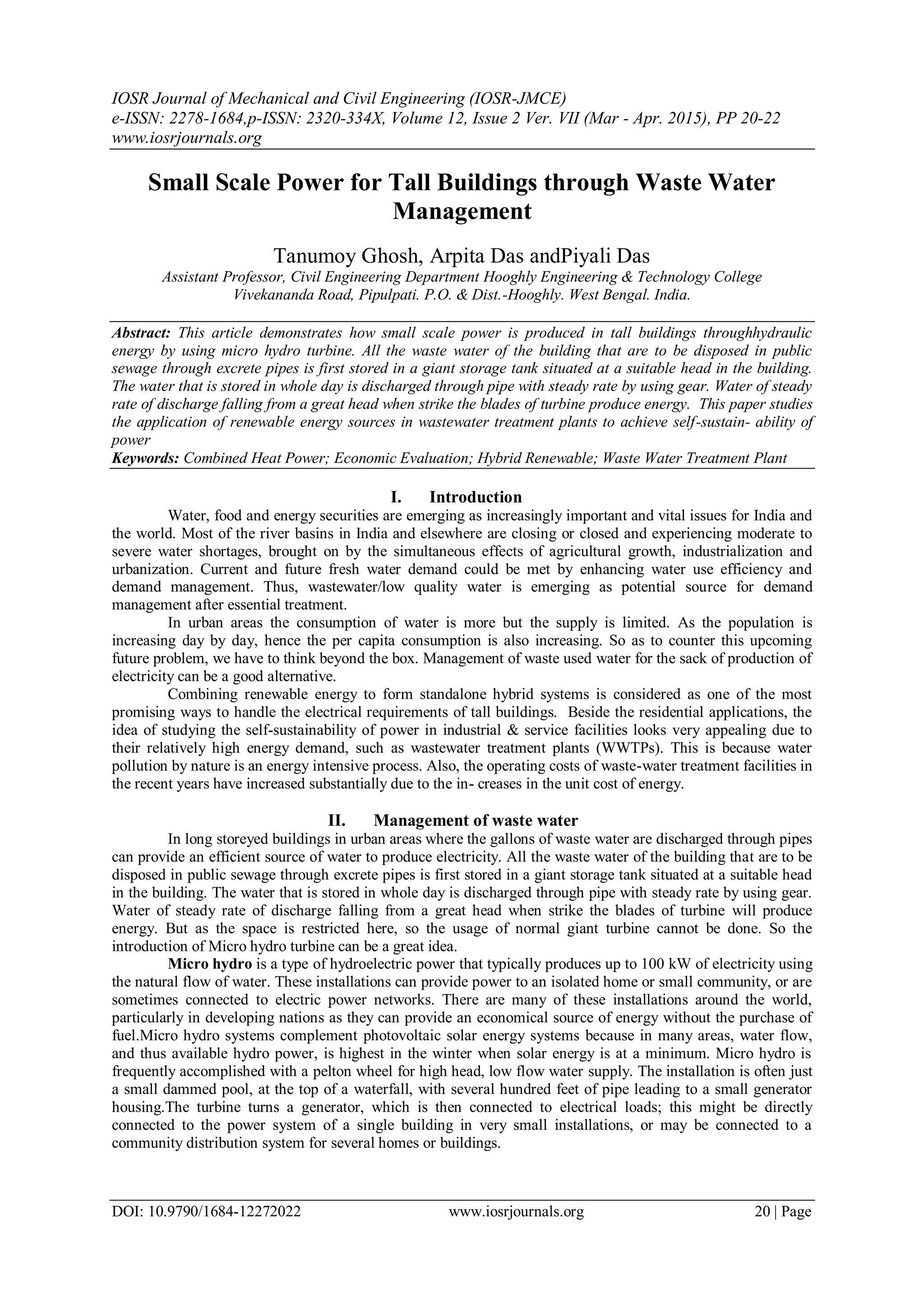 This document proposes using waste water from tall buildings to generate small-scale power through a micro hydro turbine system. Waste water from upper floors of a building would be collected in a storage tank located at a suitable head height. The stored water would then be released at a steady rate to drive a micro hydro turbine, generating electricity. For a sample 25-story building housing 50 families, the system could produce an estimated 17 kilowatt-hours of power per day by utilizing waste water from the upper 30 units. While challenges include setting up the storage tank and turbine maintenance costs, the system provides a renewable and pollution-free way to recover energy from waste water with minimal initial investment.