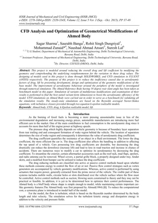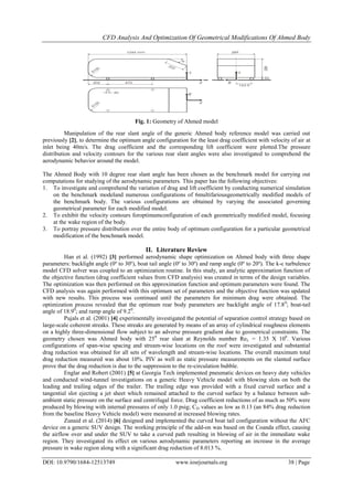 This document discusses computational fluid dynamics (CFD) analysis and optimization of geometric modifications to the Ahmed body to reduce drag and lift coefficients. The Ahmed body is a simplified bluff body shape used to model important car-like geometry features. The study aims to investigate how modifying parameters like rear slant angle, boat tail angle, and ramp angle can influence aerodynamic performance. CFD simulations are conducted using various turbulence models to analyze velocity contours and pressure distributions around modified geometries. The document reviews several past studies exploring techniques like rear slant angle manipulation, surface roughness elements, trailing edge blowing slots, boat tail configurations, and base bleed outlets for reducing drag on bluff bodies.