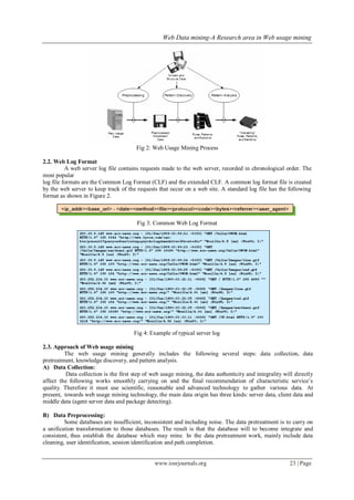 This document provides a summary and analysis of web usage mining systems and technologies. It begins with an introduction to web mining and discusses the three main categories: web content mining, web structure mining, and web usage mining. The majority of the document then focuses on web usage mining, covering the concepts, typical data sources, log formats, preprocessing approaches including data cleaning, user/session identification and path completion, knowledge discovery methods, and pattern analysis. It also provides details on an online web personalization system called SUGGEST that utilizes these techniques to provide personalized recommendations to users.