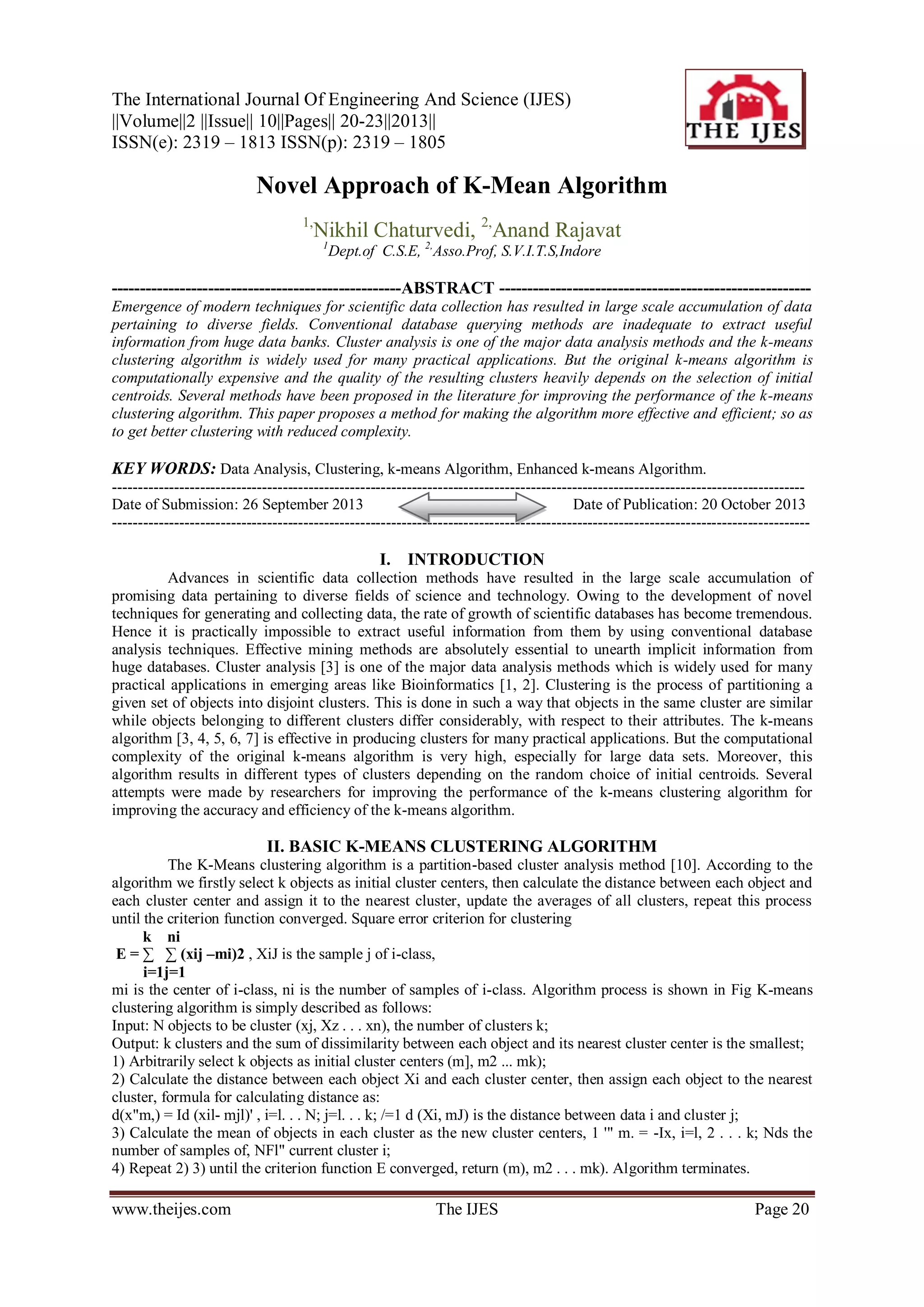 This document summarizes a research paper that proposes a novel approach to improving the k-means clustering algorithm. The standard k-means algorithm is computationally expensive and produces results that depend heavily on the initial centroid selection. The proposed approach determines initial centroids systematically and uses a heuristic to efficiently assign data points to clusters. It improves both the accuracy and efficiency of k-means clustering by ensuring the entire process takes O(n2) time without sacrificing cluster quality.