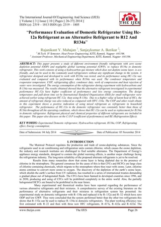 This document summarizes an experimental study that evaluated the performance of HC-12a (a hydrocarbon refrigerant mixture) as an alternative to R134a in a domestic refrigerator. The refrigerator's performance was tested using each refrigerant and results for temperature, coefficient of performance (COP), energy consumption, and other metrics were compared. Testing showed HC-12a had a higher COP, less energy consumption, and achieved temperature targets faster than R134a. Overall the study found HC-12a performed better than R134a and could be used as a replacement without system modifications.