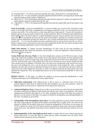 This document summarizes a research paper on secured authorized deduplication in a hybrid cloud system. The system aims to provide data deduplication, differential authorization for access, and confidentiality of data files. It involves a public cloud for storage, a private cloud for managing access tokens, and users who generate keys for files stored on the public cloud. When uploading a file, the user encrypts it and sends it to the public cloud along with the key to the private cloud. To download, the user must provide the correct key to the private cloud to gain access to encrypted files from the public cloud. This hybrid cloud model uses deduplication for storage optimization while controlling access through differential authorization of private keys.