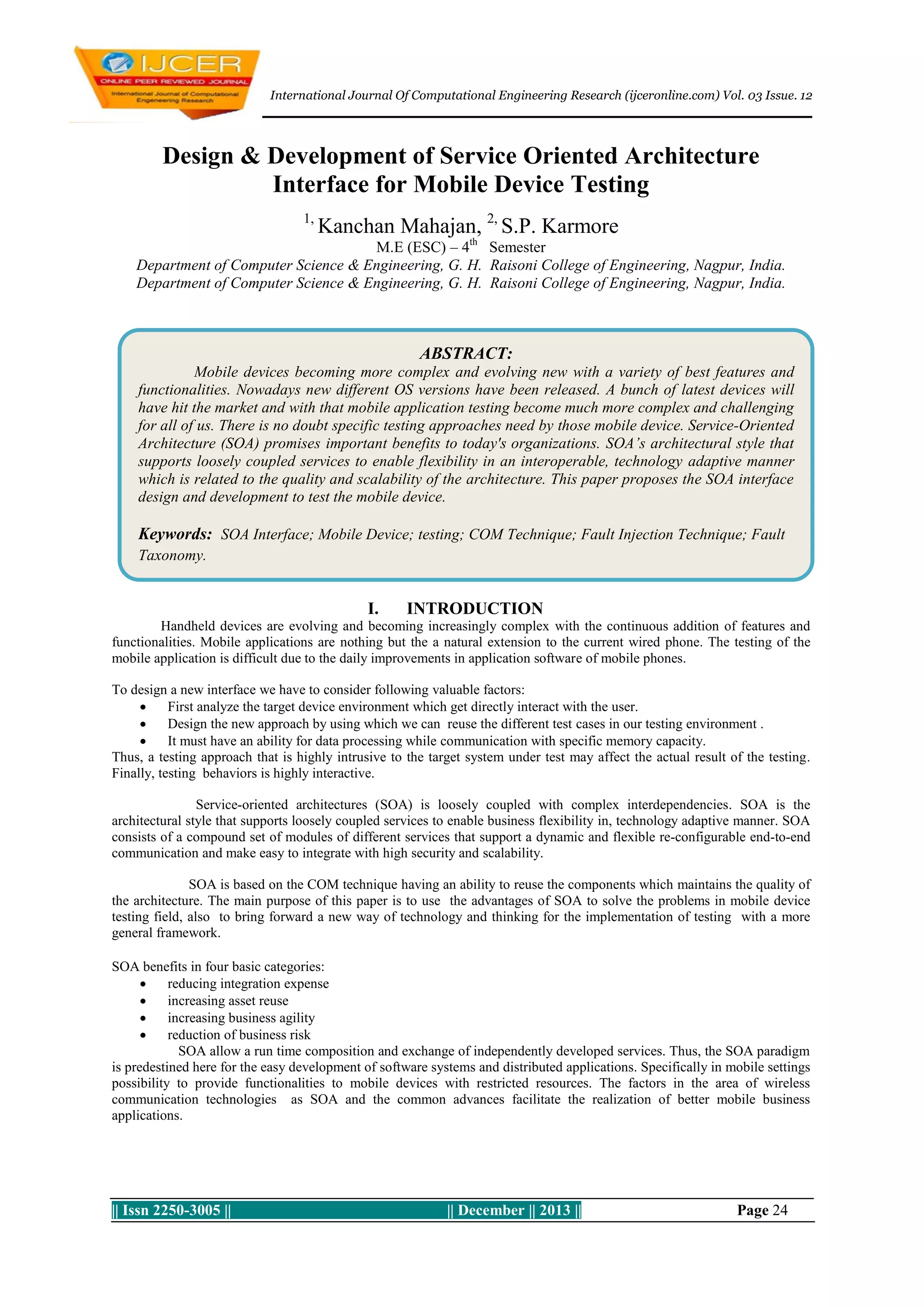 This document discusses the design and development of a Service Oriented Architecture (SOA) interface for mobile device testing. It proposes using a SOA approach to address the challenges of mobile device testing, which is made difficult by the complex and evolving nature of mobile software and hardware. The paper describes building modular components according to SOA principles and using a common interface to allow components to communicate and reuse test cases. It outlines developing fault injection techniques and a taxonomy of faults specific to SOA to test the reliability of the proposed interface. The goal is to create a more flexible and reusable framework for mobile device testing.