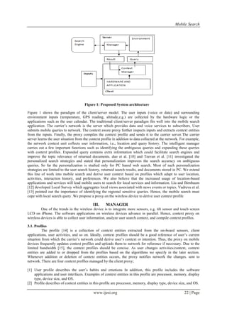This document discusses the importance of personalized mobile search and how it differs from traditional PC-based search due to limitations such as screen size and bandwidth. It proposes a client-side architecture that utilizes context profiles, derived from user information and situational data, to expand ambiguous search queries and improve result relevance. The framework aims to enhance user experience by leveraging context-aware strategies tailored to individual preferences and locations.