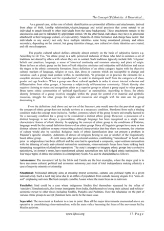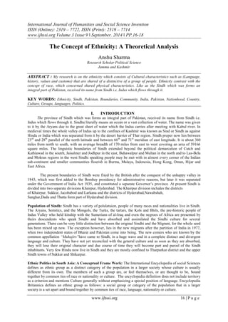 The document analyzes the concept of ethnicity, particularly focusing on the province of Sindh in Pakistan, detailing its historical and cultural dimensions. It discusses the complexity of ethnic identities in the region, influenced by diverse linguistic, cultural, and historical contexts, as well as the implications of modern migration and political dynamics. Additionally, it explores ethnic movements and polities in South Asia, highlighting various types of ethnic struggles and the challenges associated with forming cohesive national identities.