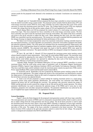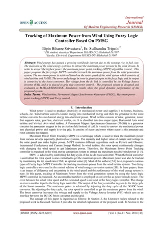 This document discusses the use of a fuzzy logic controller for maximum power point tracking (MPPT) in wind energy systems utilizing permanent magnet synchronous generators (PMSG). The proposed system enhances power extraction by adjusting the duty cycle of a boost converter based on rotor speed, with simulation results indicating effective dynamic performance. The findings demonstrate the system's ability to efficiently supply maximum power to the grid, highlighting the advantages of fuzzy control in renewable energy applications.