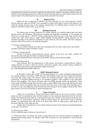This document summarizes research on injecting black hole and wormhole attacks in mobile ad hoc networks (MANETs). It provides background on MANETs and discusses their vulnerabilities to security attacks due to open wireless medium and dynamic topology. The document then describes how the researchers implemented black hole and wormhole attacks against the Ad Hoc On-Demand Distance Vector (AODV) routing protocol using the NS-2 network simulator. The simulation results showed that both attacks decreased network performance by reducing throughput and increasing packet loss. The research highlighted security as an ongoing challenge for MANET routing protocols.