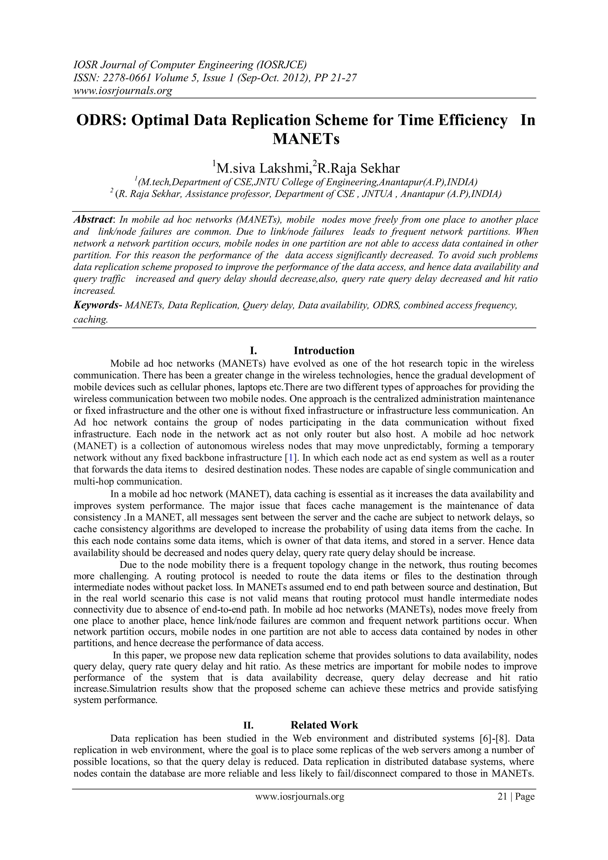 This document proposes an Optimal Data Replication Scheme (ODRS) to improve data availability, reduce query delay, and increase hit ratio in mobile ad hoc networks (MANETs). In MANETs, frequent node and link failures can cause network partitions that decrease data access performance. ODRS aims to address this issue through proactive data replication across network partitions. It considers factors like node mobility, power consumption, and resource availability to determine what data to replicate, where to place replicas, and how to access and synchronize replicated data in order to optimize data availability and query efficiency in the dynamic MANET environment. The proposed scheme is evaluated through simulation to validate that it can achieve higher data availability, lower query delay, and increased