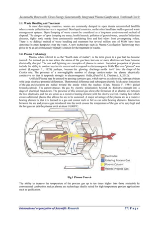 The document discusses plasma gasification as a sustainable way to generate clean energy from waste. Plasma gasification involves using plasma torches to break down waste into its basic molecular structure, producing a synthesis gas (syngas) composed of carbon monoxide and hydrogen. This syngas can then be used to generate electricity through a combined cycle system. The inorganic materials in the waste are vitrified into a glass-like slag. Plasma gasification is presented as an environmentally friendly alternative to landfilling or incineration as it produces no hazardous emissions or ash residue. The document also analyzes the composition of municipal solid waste in Abuja, Nigeria to examine its suitability as a feedstock for a plasma gasification system