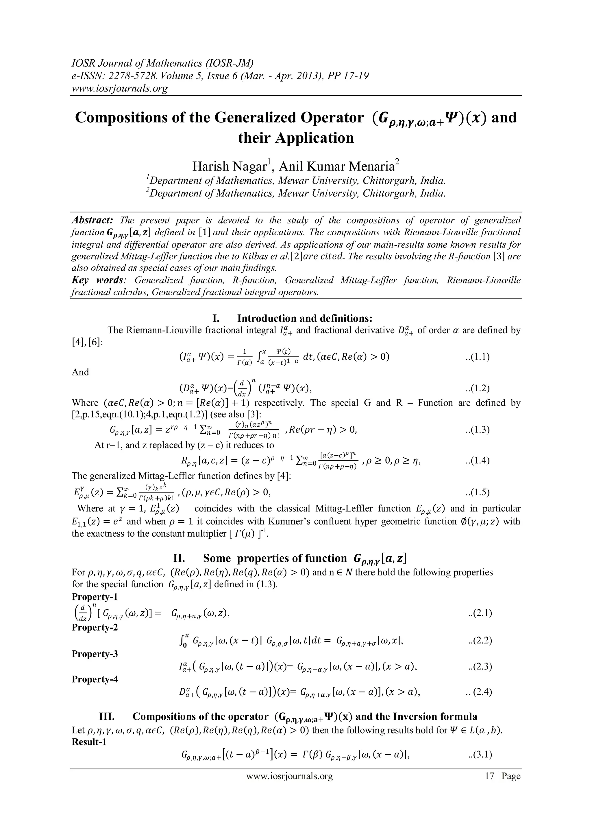 The paper explores the compositions of the generalized operator g ρ,η,γ,ω;a+ ψ and their applications, particularly focusing on fractional calculus and the generalized Mittag-Leffler function. It derives key results involving the Riemann-Liouville fractional integral and differential operators, providing various properties and inversion formulas. Additionally, the document references known results from previous studies, linking them to the new findings presented.