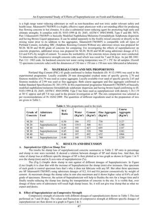 This study investigates the effects of superplasticizers on the fresh and hardened properties of concrete, specifically focusing on workability and compressive strength across different concrete mixes. The research utilized Sikament®170 as the superplasticizer, evaluating its impact through various dosages (0.2%, 0.4%, and 0.6%) in concrete grades M-20, M-30, and M-40. Results indicated that superplasticizers significantly enhance workability and compressive strength, allowing for improved concrete performance at lower water/cement ratios.