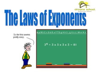 This document discusses the laws of exponents. It defines what exponents mean and provides examples. The key laws of exponents covered are: