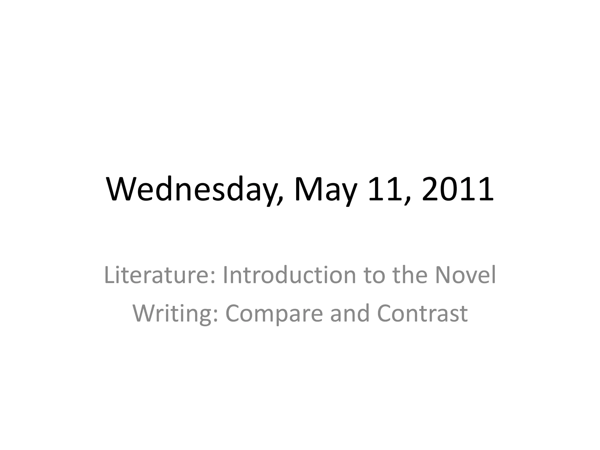 This document provides an overview of a literature and writing class. It discusses introducing novels, choosing novels to study, and presenting novel outlines and handouts. It also covers comparing and contrasting, explaining the two methods of organization - block and point-by-point. Students are instructed to read about these methods and given an individual practice assignment to outline a comparison or contrast topic without writing a full paragraph. Homework includes a grammar quiz, poetry exam, beginning a novel, and reviewing class materials.