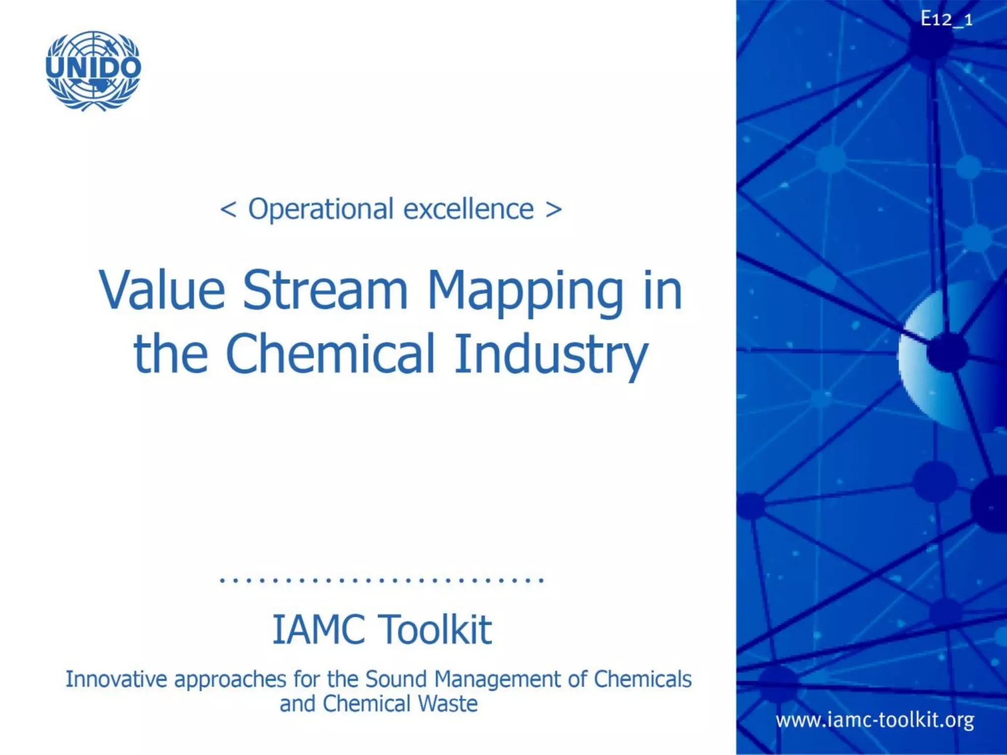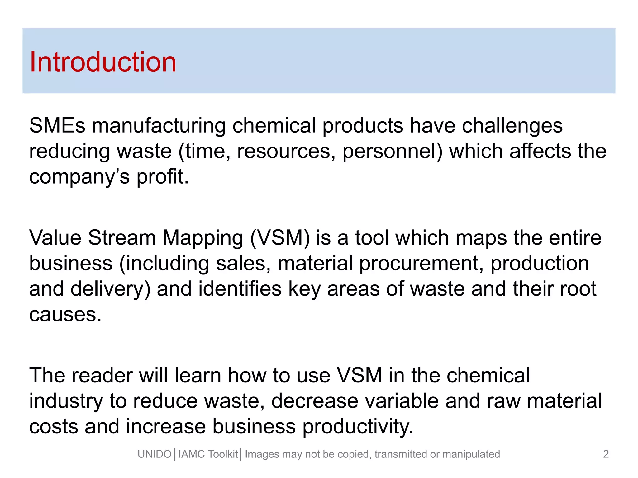 The document provides an introduction to value stream mapping (VSM) for small and medium enterprises in the chemical industry. It explains that VSM is a tool that maps the entire business process to identify sources of waste and their root causes. The goal is to reduce waste, decrease costs and increase productivity. The document outlines the key components of a VSM, including material flow, information flow and timeline. It also explains how a VSM is generated and some best practices. The reader will learn how to use VSM to improve operations in the chemical industry.