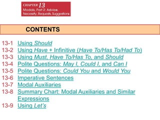 This document contains a chapter about modals and expressions used to give advice or make requests in English. It includes sections on using "should", "have to/has to/had to", "must", polite questions with "may", "could" and "can", imperative sentences, modal auxiliaries like "can" and "may", and expressions with "let's". Each section provides examples and explanations of the grammar structures.