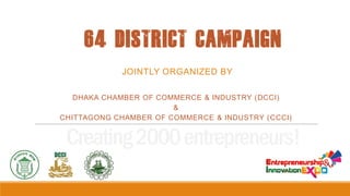 The document outlines plans for a joint campaign by the Dhaka Chamber of Commerce and Industry and the Chittagong Chamber of Commerce and Industry to create 2000 entrepreneurs. It provides details on an upcoming motivational session in Chittagong, including the schedule of speakers, attendees, and goals of recognizing talents, inspiring leadership, and empowering youth through entrepreneurship. A budget breakdown is also included, with costs to be shared between the two Chambers of Commerce.