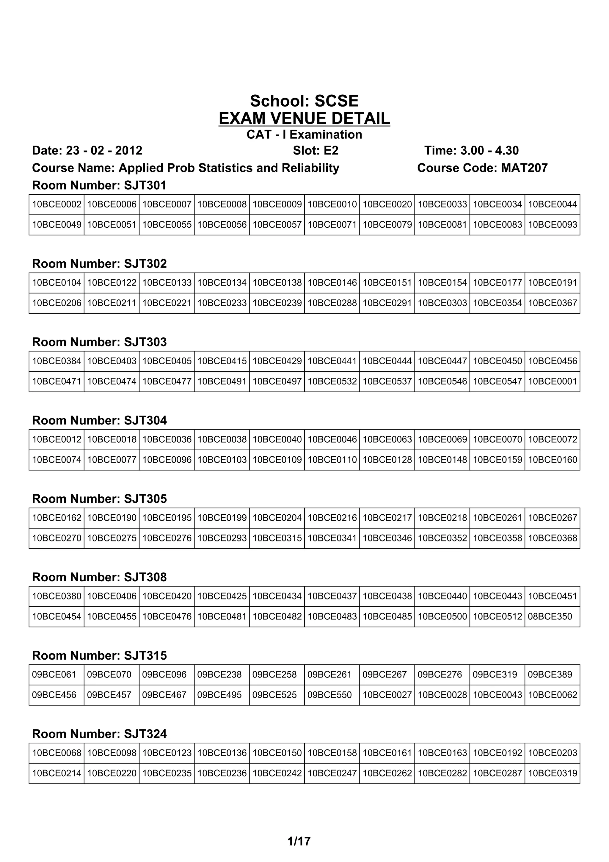 The document provides details of exam venues for various courses at the SCSE school. It lists the room numbers and student roll numbers assigned to each room for exams scheduled on February 23, 2012 from 3:00-4:30pm in slot E2. Exams are taking place in rooms SJT301 through SJT421 for courses including Applied Prob Statistics and Reliability, Software Engineering, and Differential and Difference Equations.