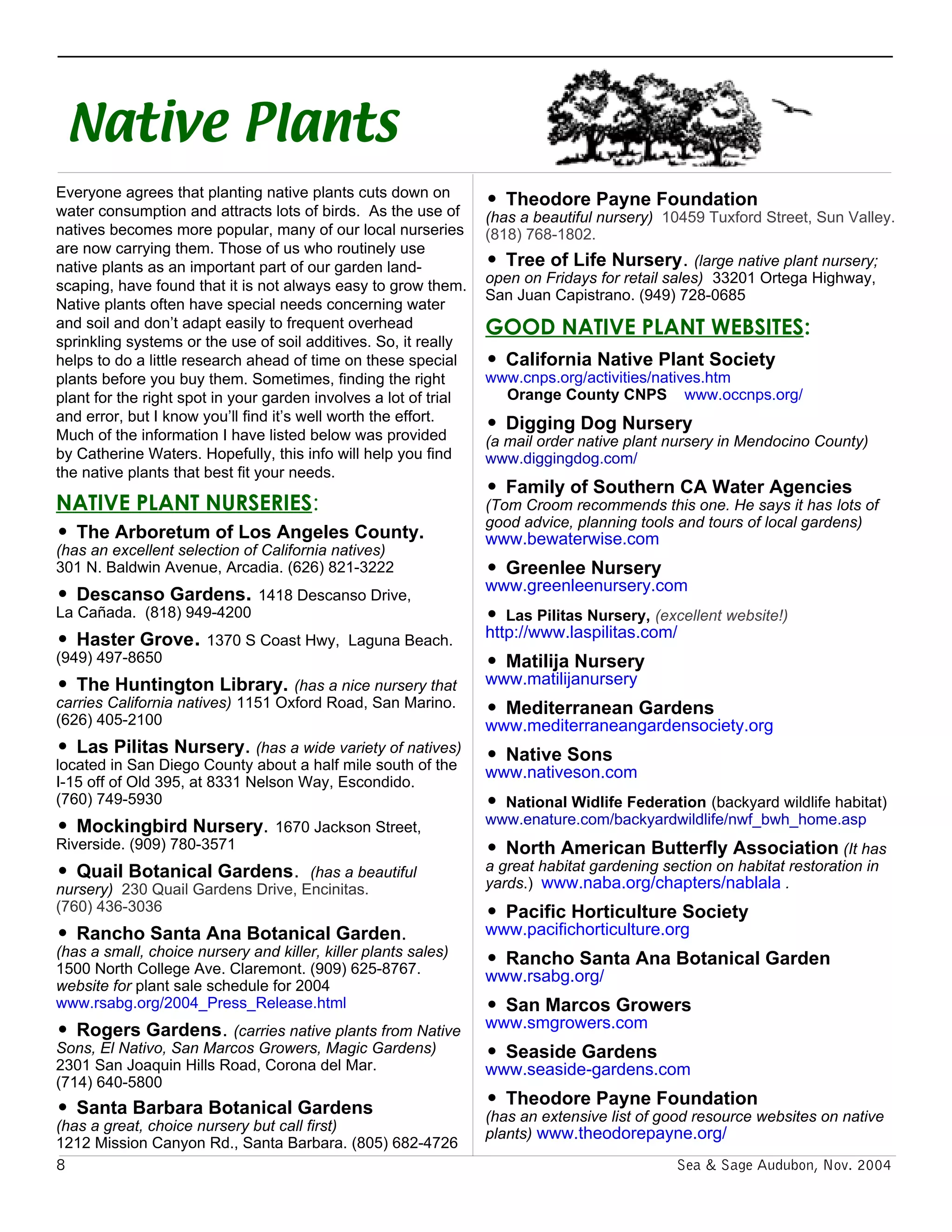 Native plants are more water efficient and attract birds. Many local nurseries now carry native plants as their popularity grows. However, native plants often have specific needs for water, soil, and care that make them difficult to establish in conventional gardens. Doing research on a plant's requirements before purchasing it can help ensure it thrives in the right conditions through trial and error. The document provides a list of native plant nurseries and websites with information to help gardeners select and care for native species.