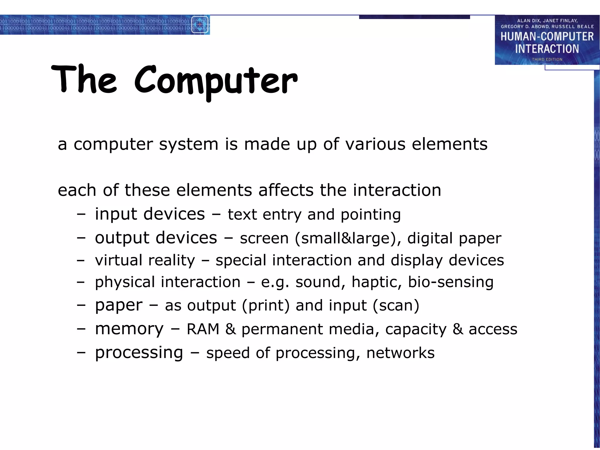 The document discusses various input and output devices used in human-computer interaction, including keyboards, mice, touchscreens, styluses, digitizing tablets, and eyegaze trackers. It describes how these devices work and their advantages and disadvantages for different types of interaction.