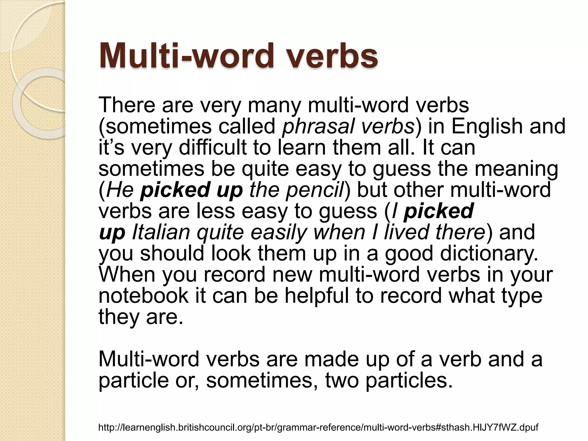 This document discusses multi-word verbs in English, which are sometimes called phrasal verbs. It explains that multi-word verbs are made up of a verb and a particle or particles. They can be transitive or intransitive, separable or inseparable. The document provides examples of different types of multi-word verbs such as phrasal verbs, prepositional verbs, and phrasal-prepositional verbs. It emphasizes the importance of understanding whether a multi-word verb is separable or inseparable and where to place objects with the verb.