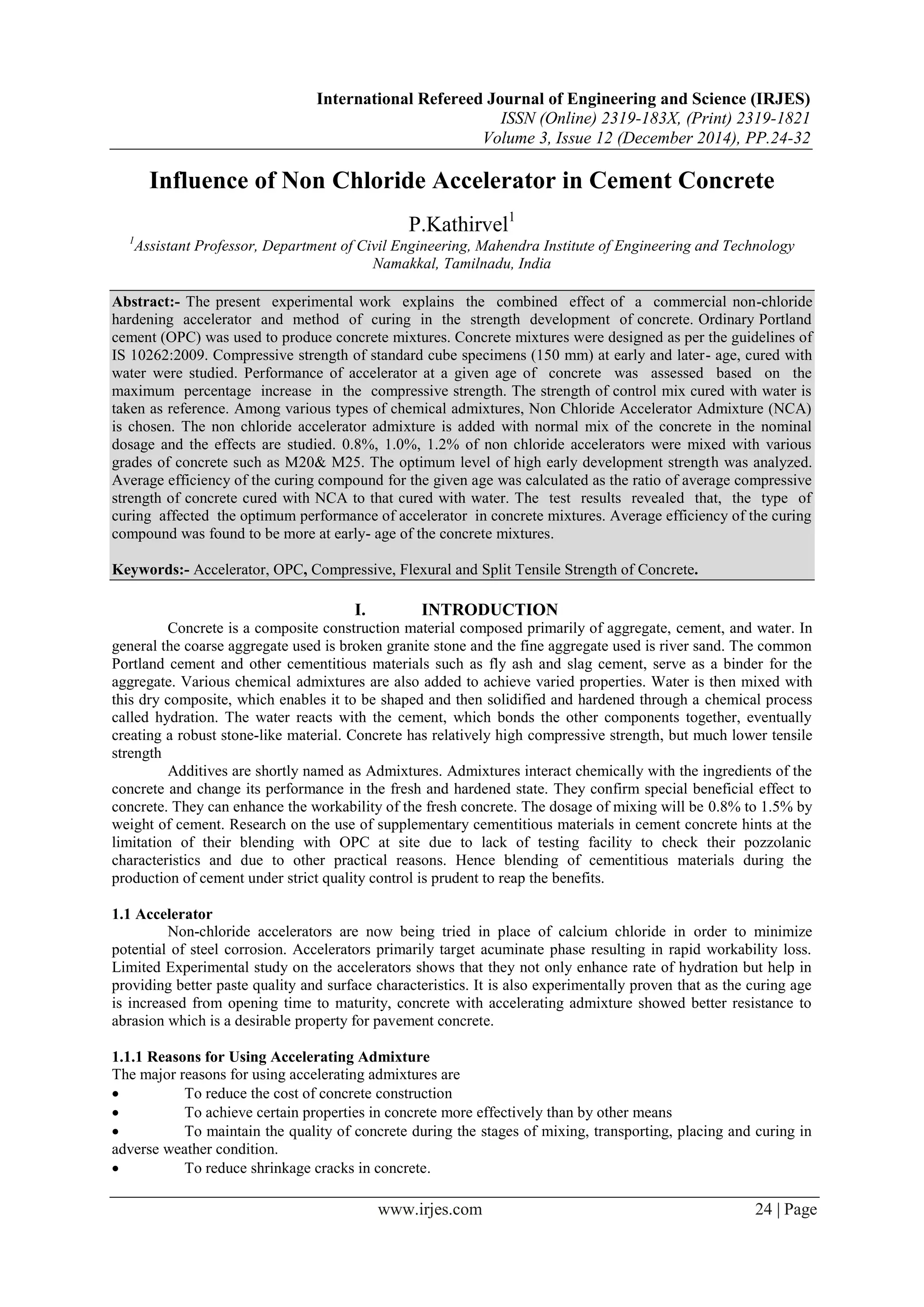 This study investigates the effects of a non-chloride accelerator on the strength development of concrete made with Ordinary Portland Cement (OPC) under various curing methods. The results indicate that using non-chloride accelerators significantly enhances early compressive, flexural, and split tensile strength compared to control mixtures cured with water. The research highlights optimal dosages of the accelerator and the importance of curing methods in achieving the best concrete performance.