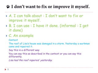 The document discusses having a roof repaired. It states that the author did not want to fix or improve their roof themselves, so they had it repaired by someone else. It provides an example of Lisa having her roof repaired by a workman after it was damaged in a storm.