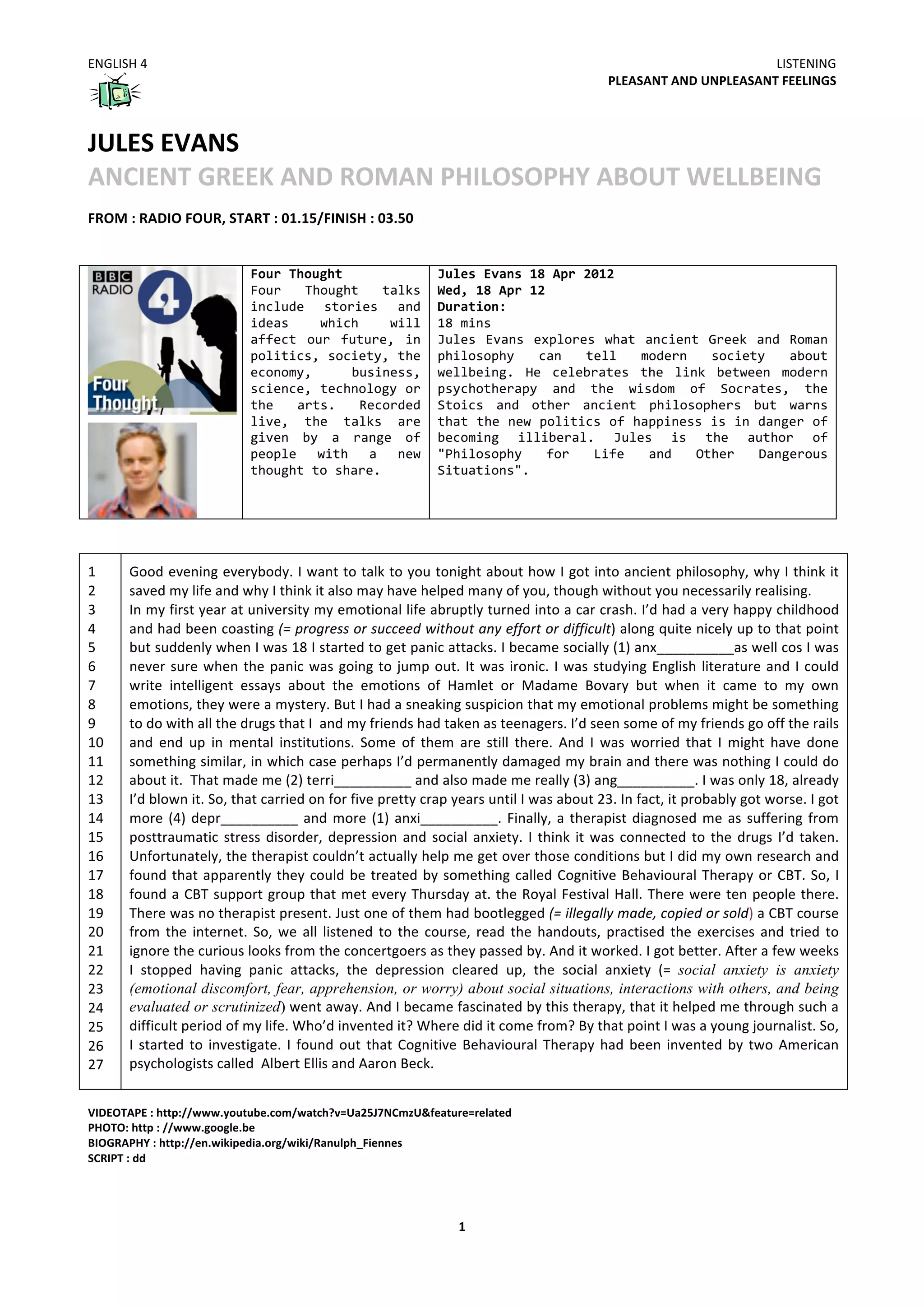 Jules Evans explores ancient Greek and Roman philosophy's perspectives on well-being and their connection to modern psychotherapy. He celebrates how modern psychotherapy relates to the wisdom of thinkers like Socrates and the Stoics. However, he warns that the new focus on happiness risks becoming too restrictive. The radio program discusses Evans' research into how ancient philosophy helped him personally overcome mental health issues like anxiety and depression.