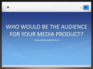 This document summarizes the research done to identify the target audience for a science fiction media product. The research included analyzing advertisements for sci-fi films, conducting public surveys, and reviewing social media feedback. The research found that the ideal target audience was Asian males aged 26-40 who enjoy sci-fi films, gaming, gadgets, and television shows like CSI. To appeal to this audience, the media product included action scenes, unpredictability, and references to their interests.