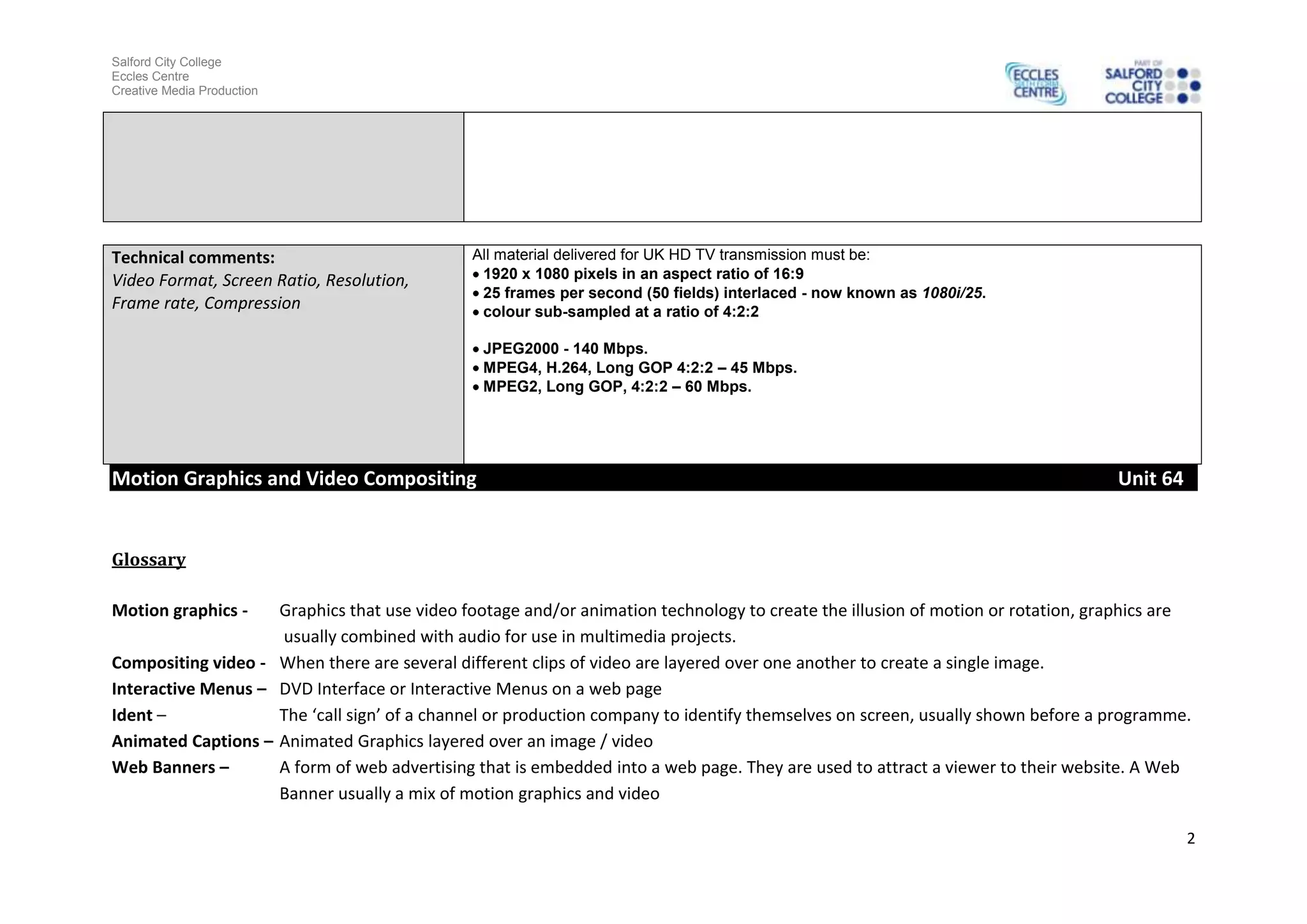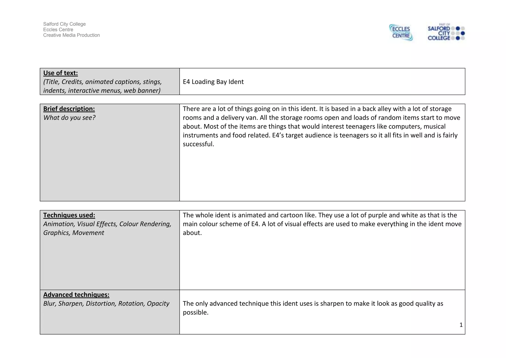 This document provides information about an ident for the E4 television channel. The ident takes place in a back alley storage area and features random items like computers and musical instruments moving about. The ident uses animation and a purple and white color scheme to create a cartoon-like style that fits E4's target teenage audience. Advanced techniques like sharpening are used to achieve high quality for HD television transmission, which requires a resolution of 1920 x 1080 pixels, 16:9 aspect ratio, and other technical specifications.