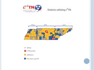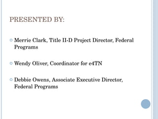 This document summarizes an e-learning program called e4000TN that is funded by stimulus money. It provides online courses to Tennessee students and is implemented across districts in the state. It outlines the program details including available courses, how it complies with federal regulations, reimbursement procedures, budget amendments, and contact information for questions.