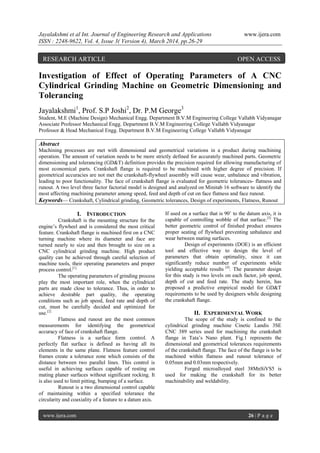 This document investigates the effect of operating parameters on the geometric dimensioning and tolerancing (GD&T) of a CNC cylindrical grinding machine, specifically focusing on the crankshaft flange. A factorial design experiment was conducted to analyze the influence of speed, feed rate, and depth of cut on face flatness and runout, with results indicating optimal settings for minimal geometric errors. The study concludes that while the derived predictive models have limitations, they highlight the significance of certain parameters in achieving precise machining results.