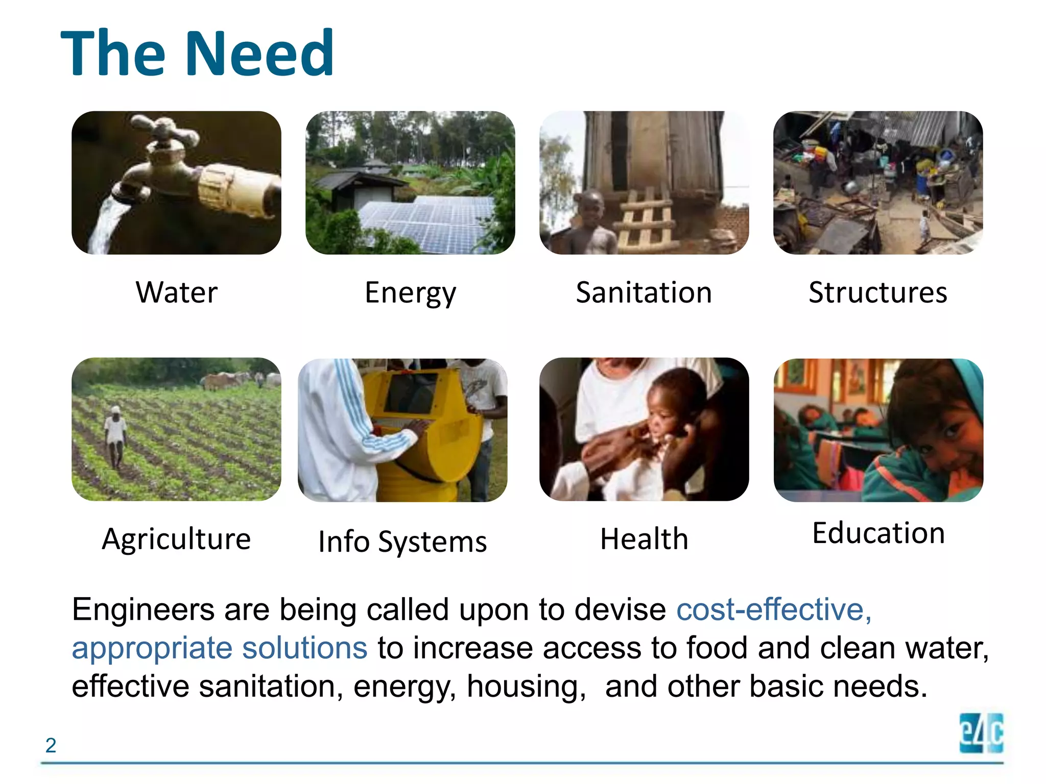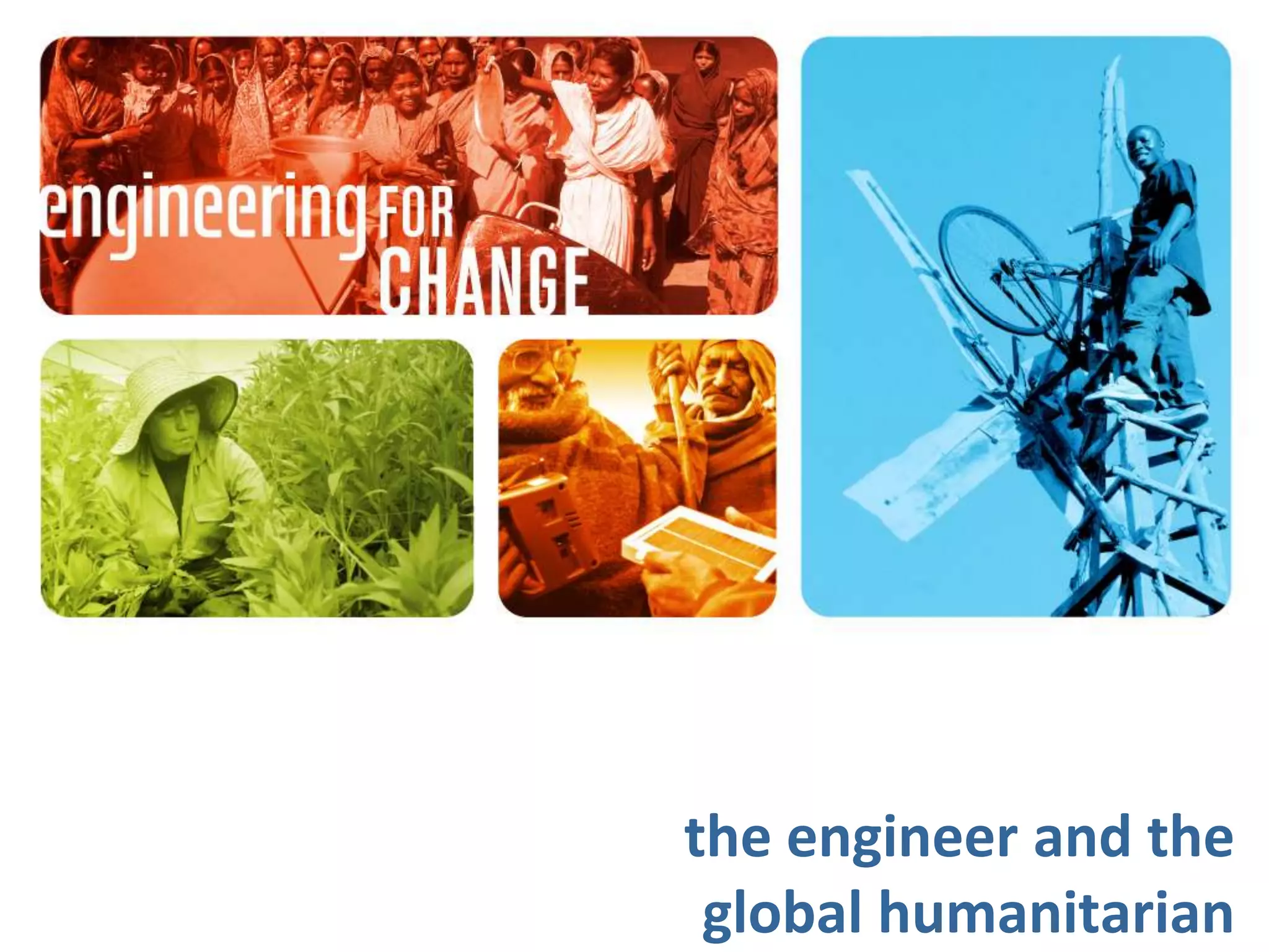Engineers are being called upon to address basic needs like food, water, and sanitation through affordable, appropriate solutions. Engineering for Change (E4C) aims to connect engineers virtually to work on these issues. E4C's online platform provides content, connects communities, and enables collaboration around technological solutions. It features topics pages, a solutions library, member profiles, and workspaces for crowdsourcing challenges. E4C seeks to grow its partnerships, content, and programs to better support engineers in improving lives worldwide through appropriate technology development.