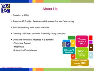 e4e is a global IT and business process outsourcing company founded in 2000 that focuses on technical support, healthcare, and interactive entertainment services. It has over 3000 employees across offices in 4 countries, serving over 100 clients. e4e brings deep domain expertise in its business areas and offers a flexible global delivery model.